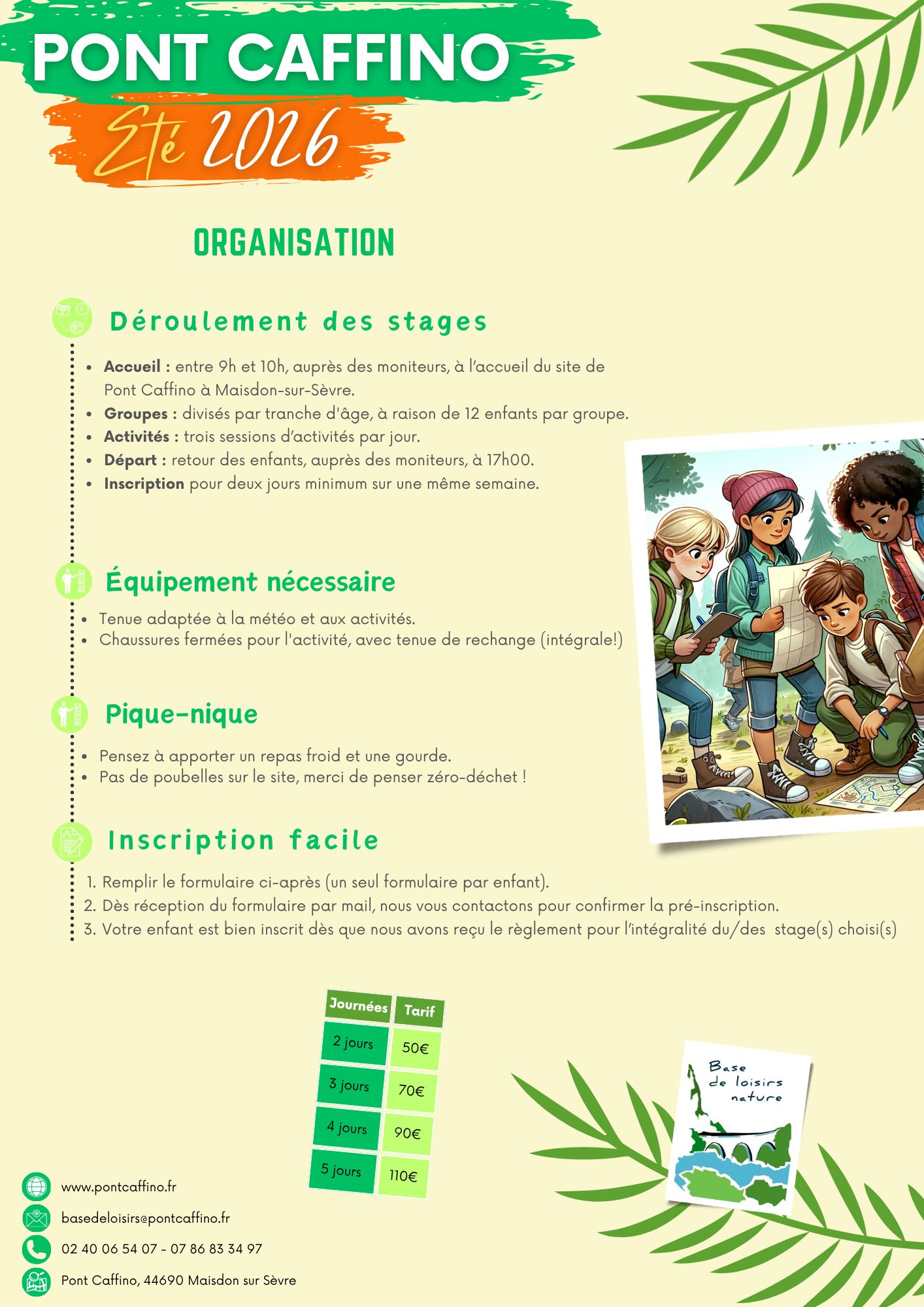 Informations : 02 40 06 54 07 – 07 86 83 34 97 – basedeloisirs@pontcaffino.fr